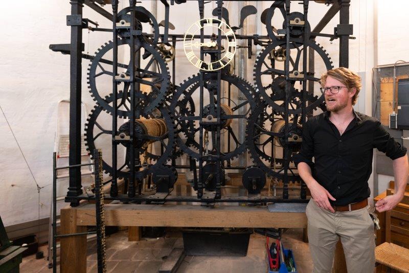 Op het automatisch speelwerk van het carillon kun je elk kwartier een muziekje horen.
